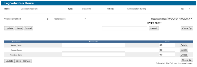 If you are making changes on one day you can UPDATE your changes and then browse to another day or volunteer’s hours. When finished you can SAVE your changes and return to the Opportunities List page or Match Volunteers page.