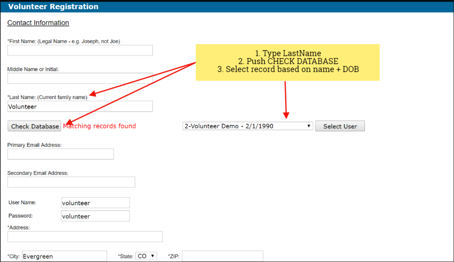 4. From the dropdown list of names choose the volunteer with the correct DOB