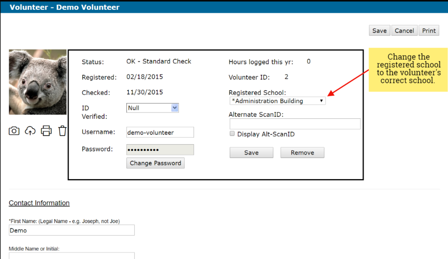 This will cause the volunteer to appear on the volunteer list of school you selected as their registered school and disappear from your volunteer list. If you only change the registered school they will appear on the school list, but will also remain on the central office list.