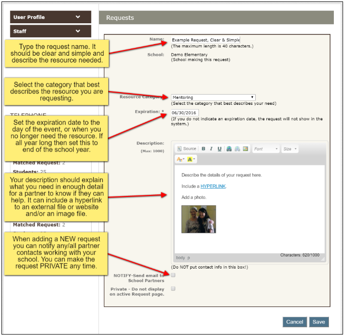 EXPIRATION - This is the date when your request will no longer appear on the website for partners to search. If this request is related to a particular event then the date of the event should be your expiration date. If it is a request that runs all year, then put the last day of school as your expiration date.
